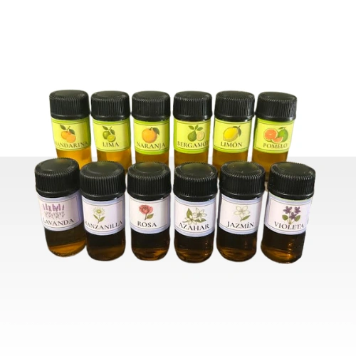 limón, naranja, bergamota, lima, mandarina, pomelo, jazmín, manzanilla, violeta, lavanda, rosa y azahar.